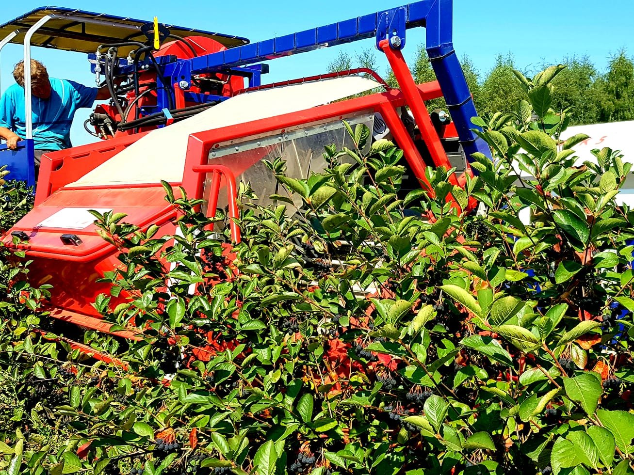 ARONIC je sklízecí stroj určený pro sklizeň plodů aronie a koncepčně vychází z našeho univerzálního polořádkového sklízecího stroje na keřové ovoce JAREK5.